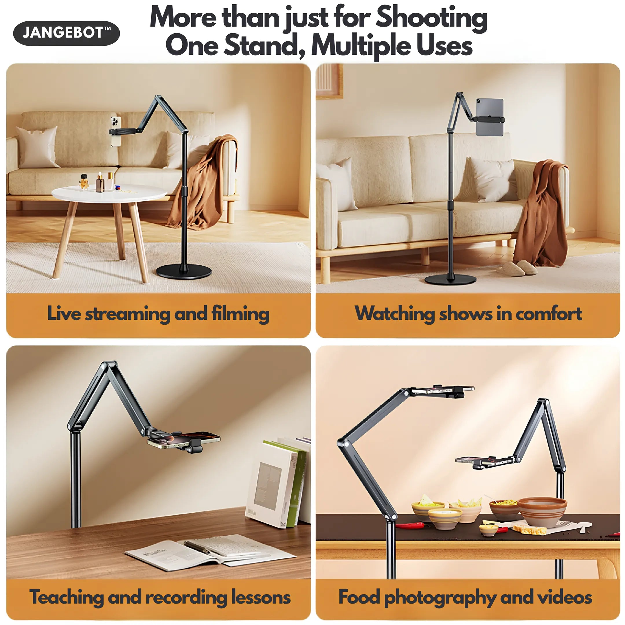 When you are lying in bed, bathing, cooking, playing music, training on the treadmill, playing switch games or following workout videos, you can use this tablet floor stand to read or watch. You can also use it to take photos, video conferences, online lessons, TikTok livestreams, overhead camera recordings, etc.