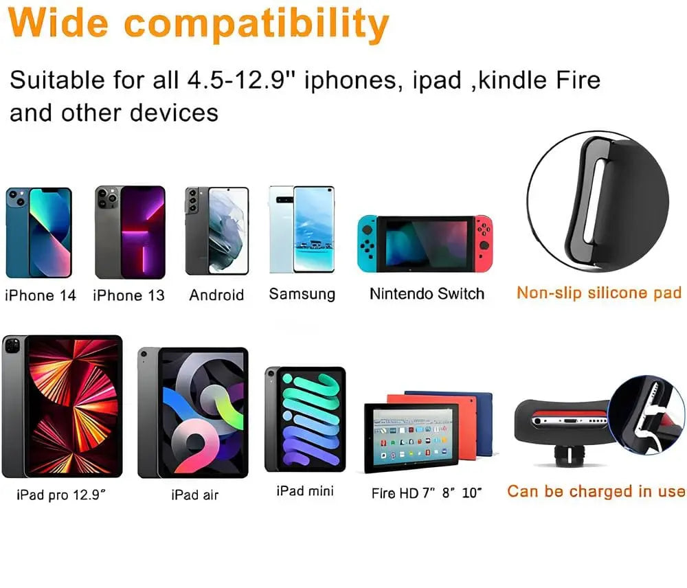 It works with various tablets and mobile devices ranging from 4.5 to 12.9 inches, including iPad mini, iPad, iPad Air, iPad Pro 12.9'', and many other tablets. For smartphones like iPhone7, 7plus, 8, 8plus, x, XR, xs, xs max, iPhone 11, 12, 13, 14, 15, 16, 17 series.Galaxy Tab,Fire 7, Fire HD 8, Fire HD 10, N- Switch and etc.